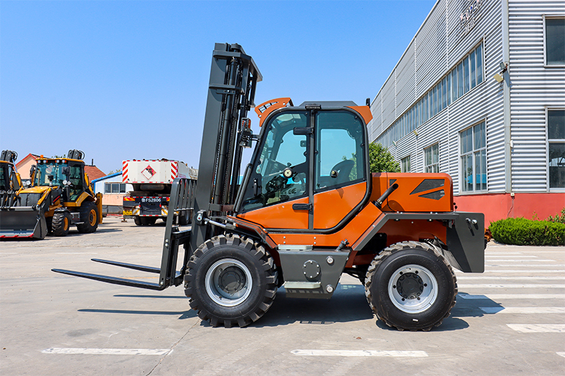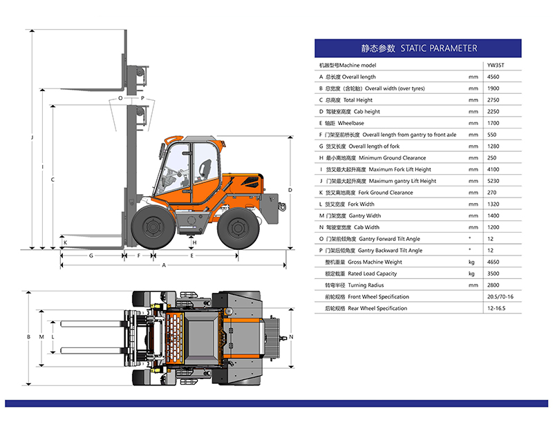 一体式越野叉车(YW35T)为加厚货叉,精选钢材提升载重,前轮20.5半实心轮胎,后轮12-16.5真空钢丝轮胎,后轮转向,承载 力和脱困能力更强,轴距短,一体式车架,无铰接,转弯半径小,转向角度大,更适合狭小 空间作业,加装安全示宽警示灯,保证夜间安全距离作业,发动机后机盖可向上开启,更换滤芯更容易,后方挡泥板承载力强,可 供保养人员站立。
